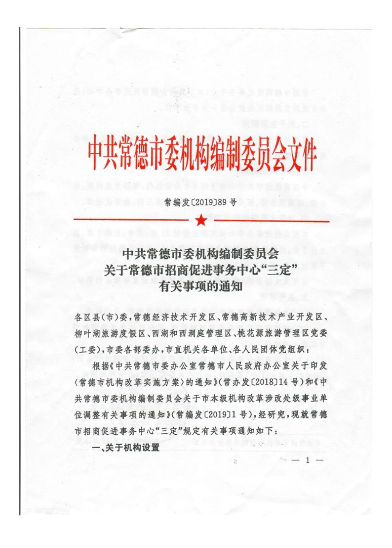 中共常德市委机构编制委员会关于常德市招商促进事务中心“三定”有关事项的通知 来源:市委编委办 发布时间:2019-12-13 09:25:21 【字体:小 大】 扫一扫在手机打开当前页 分享到: 【打印正文】