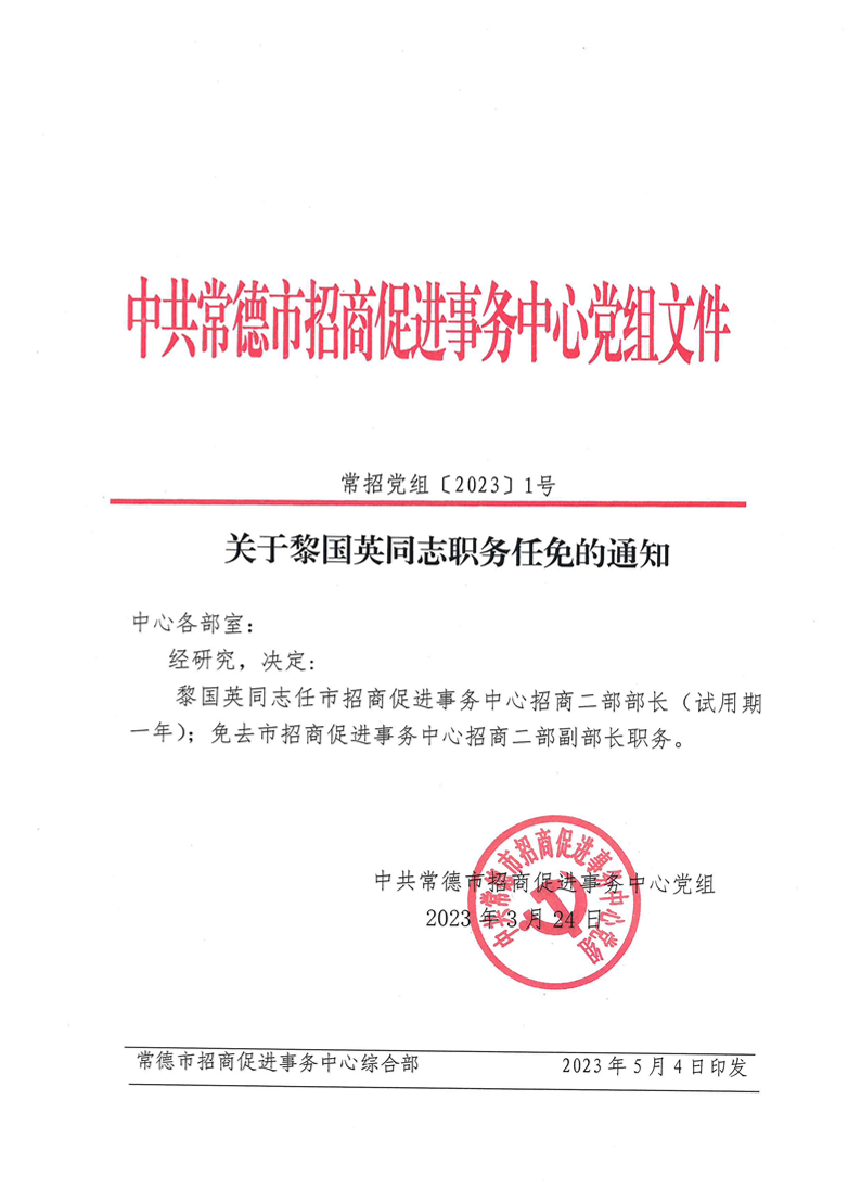 关于黎国英同志职务任免的通知