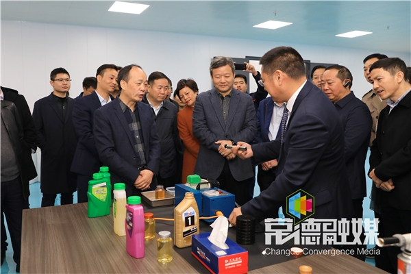 考察团一行在正大国际科技,视察润滑油产品研发生产项目